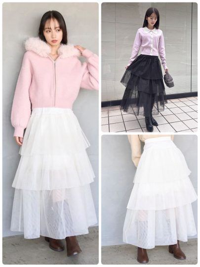 ハリのあるハードチュールを3枚重ねてボリュームアップ。透け感があるので重く見えず、ブーツ合わせもすっきりなじみます。ニットを組み合わせるスタイリングがイチオシ!ブーム続行中のバレエコアスタイルにぜひ。