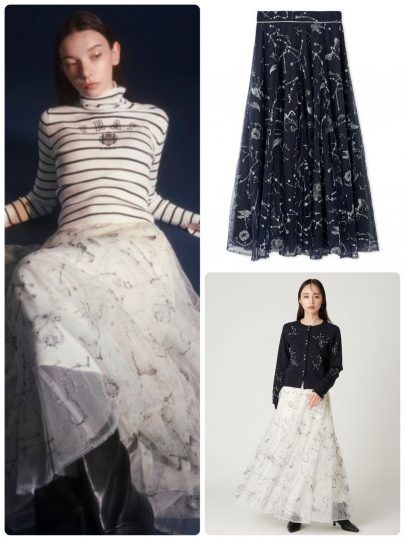 満天の星空をスカートに落とし込んだかのような、ドラマティックなチュールスカート。ラメ糸とスパンコール糸で仕立てた刺繍が華やかさを後押しします。ボリュームをたっぷりきかせた優雅なシルエットで、ドレスアップしたい日にぴったりです。また、ウエストベルトにはラメテープ、バックファスナーにはグログランテープを施したりと細部まで上品なこだわりが光る仕様。