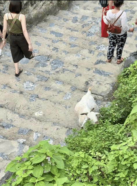 階段を登っていると、ところどころに動物のフンらしきものが落ちていて、「何だろう……?」と思っていたらヤギがいました。周りに人がいても動じることなく、ひたすら草を食べるヤギでした。