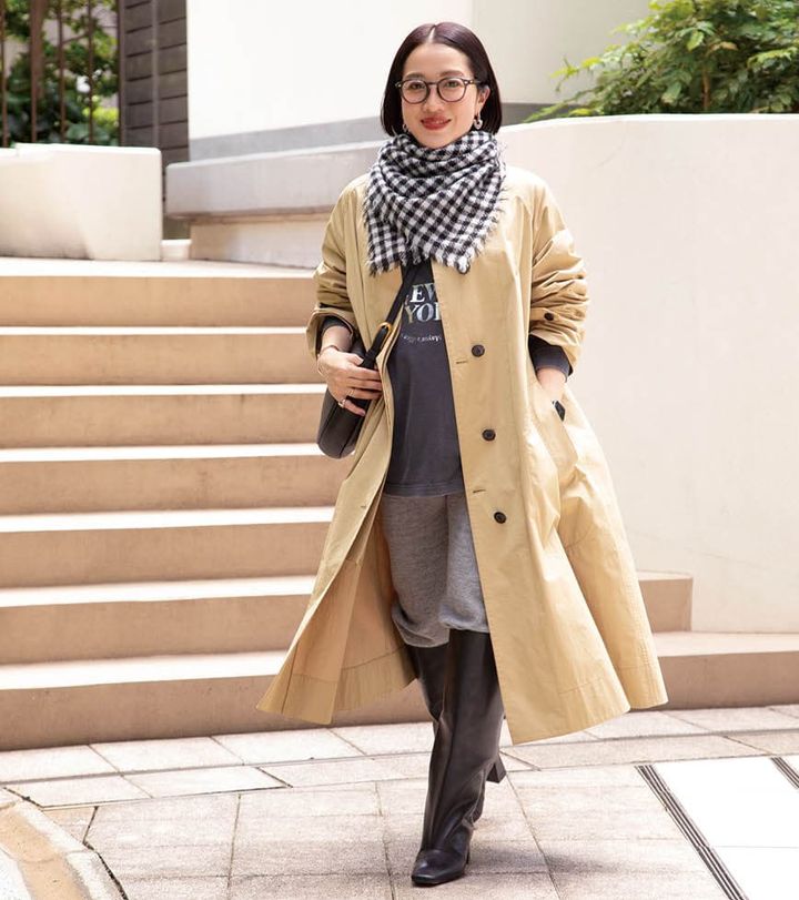 「シングルトレンチを主役に、インにはTシャツ×ニットパンツでリラックス感のあるスタイリングを意識。ブラックの小物でコーデを引き締めました」