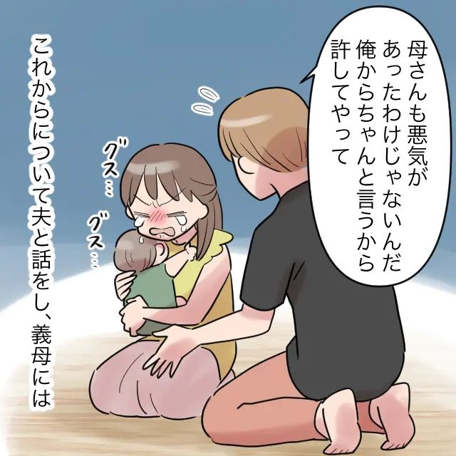 義母が帰った後、夫は「母さんも悪気があったわけじゃないんだ。俺からちゃんと言うから許してやって」と私に言いました。私は、義母にゆうを預けてしまったこと、ゆうを危険にさらしてしまったことを後悔して涙が止まりませんでした。そして、少し落ち着いてから義母とのこれからの関わり方について夫と話をしました。