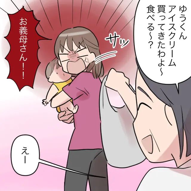 「ゆうくん、アイスクリーム買ってきたわよ~!食べる~?」と言いながら笑顔でアイスが入った袋を差し出してくる義母。私は「お義母さん!!」と叫んで慌ててゆうを抱き上げます。はぁ・・やっぱり義母は全く懲りていないようです。これからも私が義母からゆうを守り続けます!