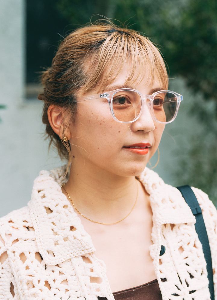 クリアフレームのメガネで秋コーデをライトに格上げ! ゴールドの華奢なネックレスできらめきをプラスして。