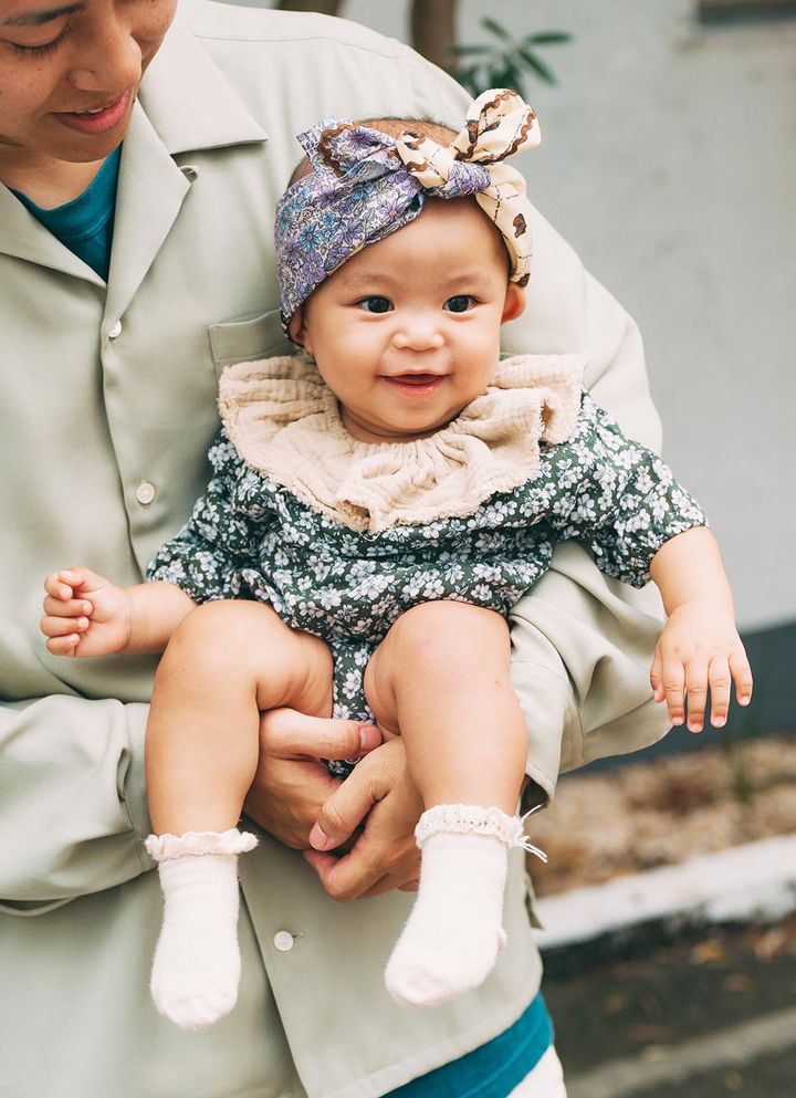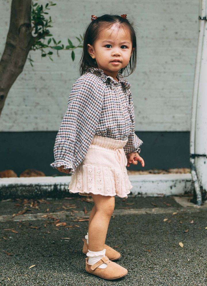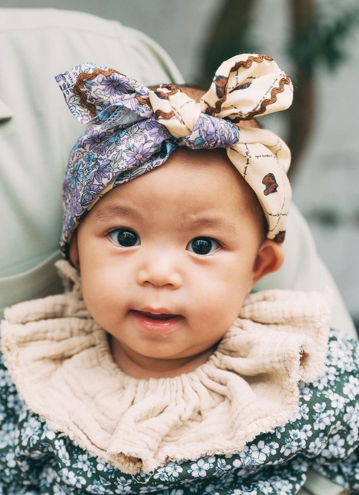プチプラ「しまむら』のスカーフをひと巻、フリルスタイで一気に華やかな装いに。ベビーならではのスタイリングが楽しいスタイリング!