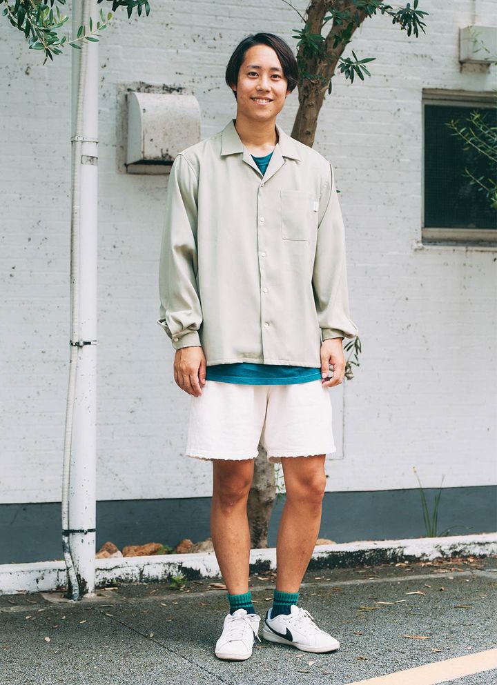 パパの秋コーデは『サタデーズニューヨークシティ』で全身統一! グリーンのインナーをアクセント役に、ライトカラーにまとめて爽やかなスタイリングにまとめ。