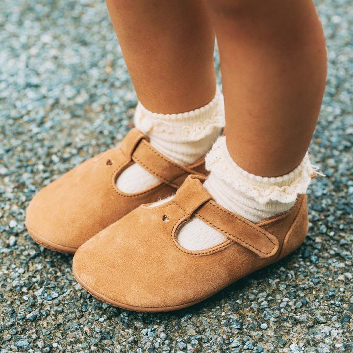 秋のお出かけにぴったりなキャメルのストラップシューズをオン! ホワイトのレースソックスを合わせておねえさんな足元に仕上げ。