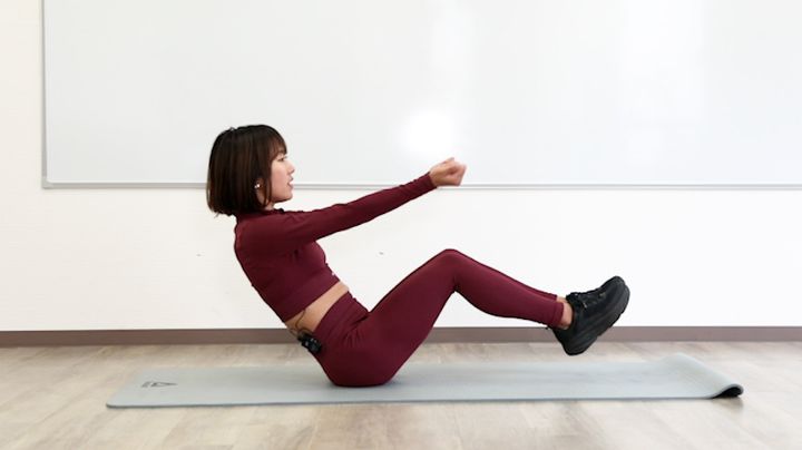 1.床に座り、上半身と下半身を地面から浮かせてお尻だけでバランスをとる