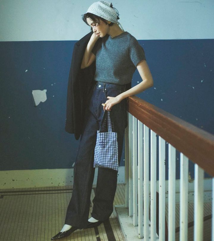 シックなインディゴカラーは、カジュアル過ぎずキレイめな印象で着られます。オフホワイトのソックスをのぞかせるのも、ならではの楽しみ方。バンダナやギンガム柄のバッグなど、キャッチーな小物でハズすと洒落感アップ。