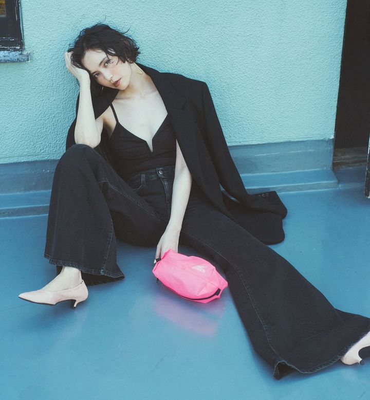 「はき込んでいる感じもナイス!」サングラス¥59,400(ジェントルモンスター/エム)、バッグ¥82,500(ホリデイ/ホリデイ/フラッグシップサロン オフィス)、バッグに付けたキャップ¥7,480(シー/エスストア)、スニーカー¥11,000(ムーンスター/ムーンスター カスタマーセンター)