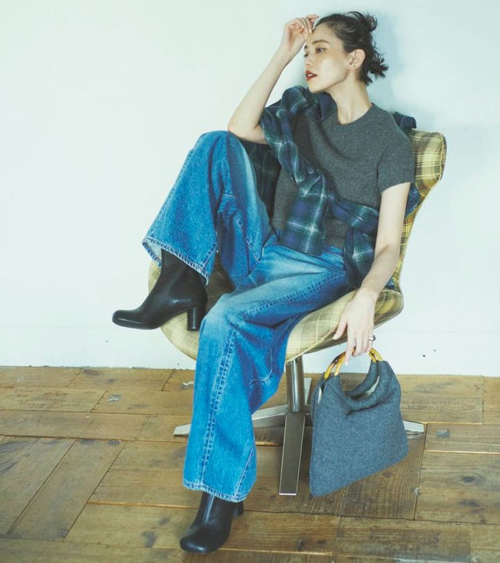 存在感のあるルーズデニムには、コンパクトなサイジングのトップスが好バランス。ヒールのブーツを合わせ、カジュアル過ぎないスタイリングを意識。まだ暑さが残る日、シャツはたすき掛けしてアクセントに。