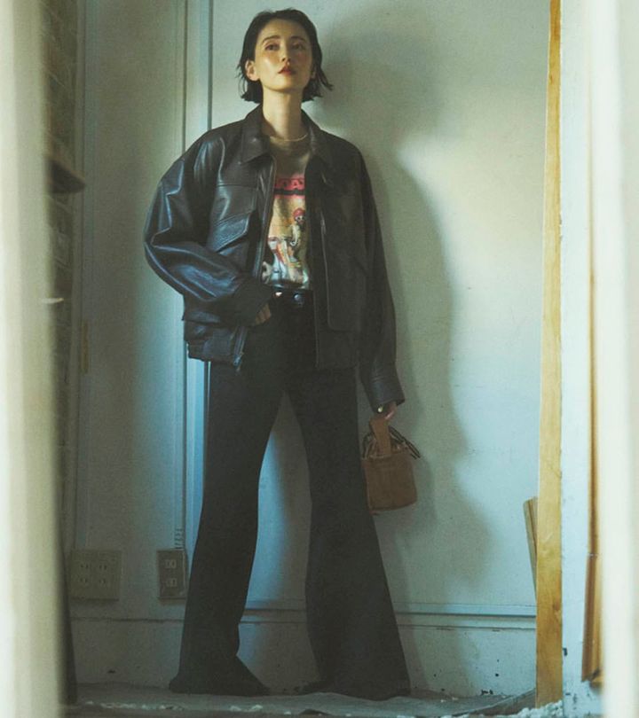 パンチのきいたTシャツとデニムで、いつもより少しだけ攻めたスタイルに。とはいえ、ベルボトムがキレイめなブラックなので、大人の品格はキープ。トレンドのレザーは、コーデ全体の引き締め役としても効果的で頼りになります。