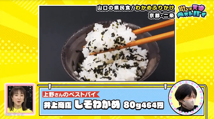 山口県から二条城に遊びに来た女性たちは、高校時代の同級生。その中の1人によると、「山口県といえば、わかめのふりかけ」なのだとか。彼女のベストバイ・しそわかめを製造している井上商店は、なんと日本で初めてソフトふりかけを開発したという山口県萩市の会社! しそわかめは白米だけでなく、パスタや天ぷら、酢の物に合わせても絶品です。