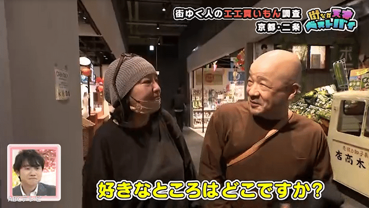 BiVi二条の2階にある昭和レトロ横丁にいた仲良し夫婦は、「年とってから一緒になった」そうで、結婚歴は約20年! 妻の好きなところを「全部かな」と夫が答えると、その場にいた全員が照れちゃいました。