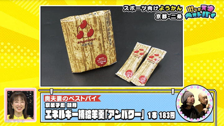 そんな愉快な夫婦は、ともに自転車で出かけるのが大好き。「琵琶湖を一周したり、嵐山から(専用ロードで)大阪に行ったり」と元気いっぱいです! 2人のベストバイは、その際の補給食として携帯している特製ようかん・アンパワー。千寿せんべいで知られる京都の有名和菓子店・鼓月(こげつ)の商品で、手軽に栄養補給できます。スポーツだけでなく、オフィスワークや勉強中の軽食にもピッタリです。