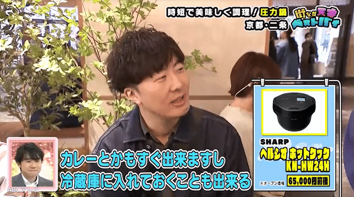 BiVi二条にいたオシャレ男子のベストバイは、シャープの人気圧力鍋・ヘルシオ ホットクックシリーズ。加熱の進行に合わせて自動でかき混ぜてくれるので、食材の味がしっかり染み込んだ料理が素早く作れます。彼いわく、「カレーとかもすぐできるし、冷蔵庫にそのまま入れておくこともできる」ので、ホットクックを重宝しているそうです!