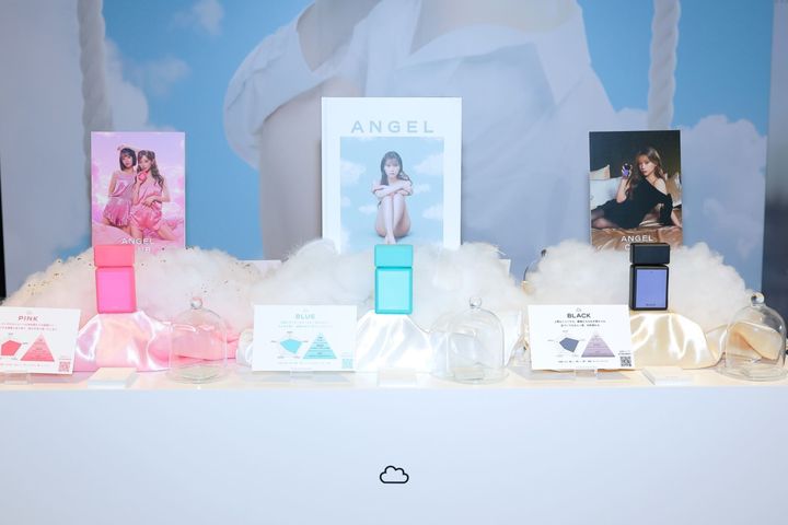 3種類の香水は“好きなパターンの天使になれる”ことがコンセプト。甘さと爽やかさが共存した、サイダーの香りの「BLUE」、いちごキャンディのような香りの「PINK」、大人っぽい色気を感じさせる香りの「BLACK」。それぞれの香水には、重盛さんのこだわりがたっぷり詰まっているのだそう。