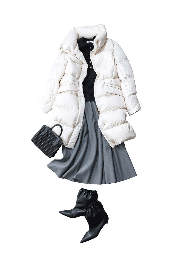ホワイトダウンコート¥97,900(ケープホーン/ティースクエア プレスルーム)ニット¥42,900(サクラ/インターリブ)スカート¥79,200(ADORE/ADORE 六本木ヒルズ店)バッグ¥79,200(ストラスベリー)ブーツ¥46,200(ピッピシック/ユナイテッドアローズ 六本木ヒルズ店)