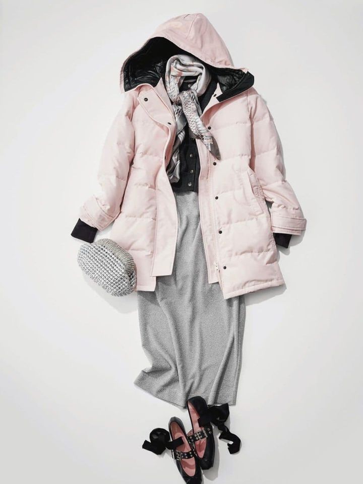 ピンクダウンコート¥242,000(カナダグース/カナダグースジャパン)ニット¥57,200(LOWER/ショールーム セッション)ラメスカート¥15,950(ジネス/ジオン商事)スカーフ¥22,000(マニプリ)バッグ¥55,000(ノアム ハザン/ティースクエア プレスルーム)シューズ¥60,500(プリティ・バレリーナ/F.E.N.)