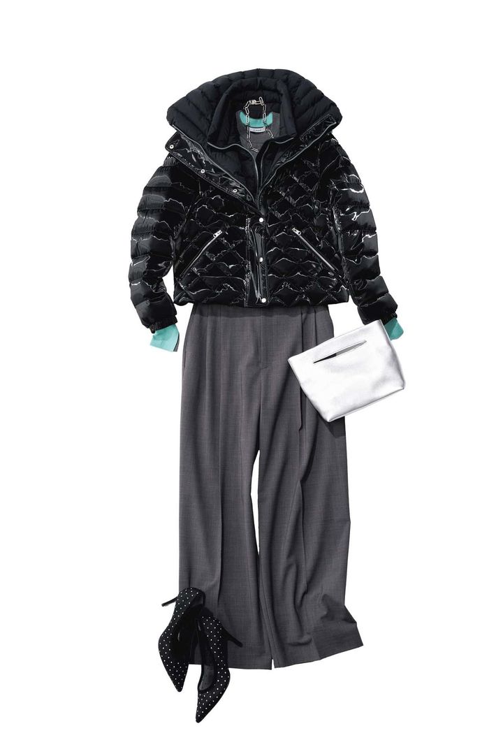 ブラックダウンジャケット¥184,800(マッカージュ/ジェイプラスインターナショナル)リブニット¥46,200ワイドパンツ¥29,700(ともにウィム ガゼット/ウィム ガゼット 玉川髙島屋S・C店)バッグ¥64,900(MIUUR/ショールーム セッション)パンプス[10月末発売予定]¥28,600(ツル バイ マリコ オイカワ)チェーンネックレス¥15,400(ダブルスタンダードクロージング/フィルム)
