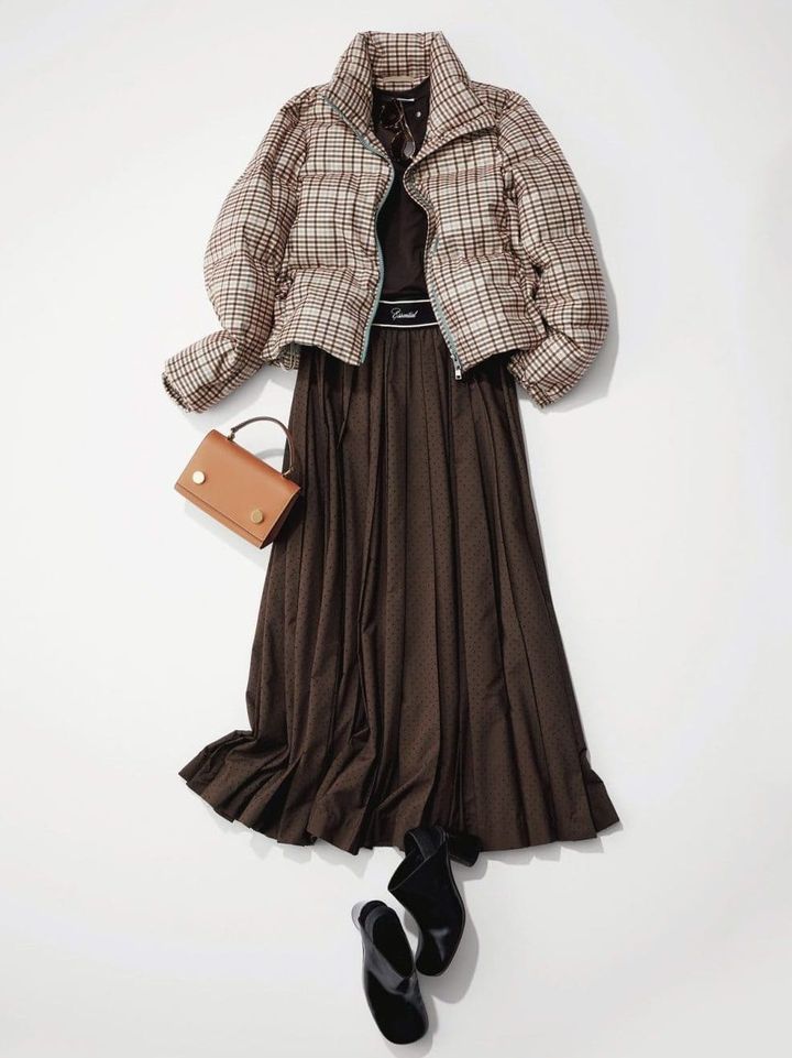 ブラウンダウンジャケット[撥水]¥26,990(TAION×UNFILO/アンフィーロ)トップス¥17,600(スタニングルアー/スタニングルアー 新宿店)リブニットタイトスカート¥27,500(LE PHIL/LE PHIL NEWoMan 新宿店)バッグ¥42,900(PUNTI./エルディスト ショールーム)パンプス¥40,700(プリティ・バレリーナ/F.E.N.)
