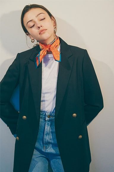 コロンとした形に親しみがわくピアスを加え、シルクスカーフをカジュアルダウン。気品に満ちたゴールドだから、ジャケット×スカーフのフレンチシックなたたずまいは保持できる。