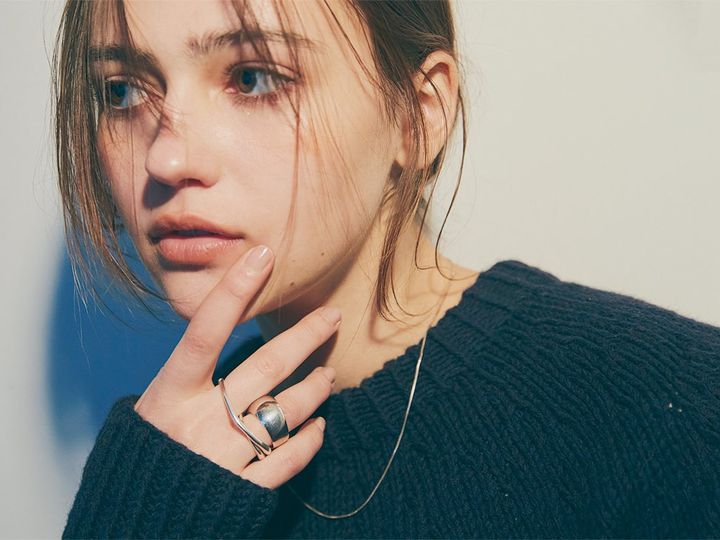 ボリュームリングと、2本の指に通してつける線の細いリングのレイヤード。きゃしゃな曲線を添えることで、太いリングのメンズっぽさも和らぎ、キレイめな仕上がりに。