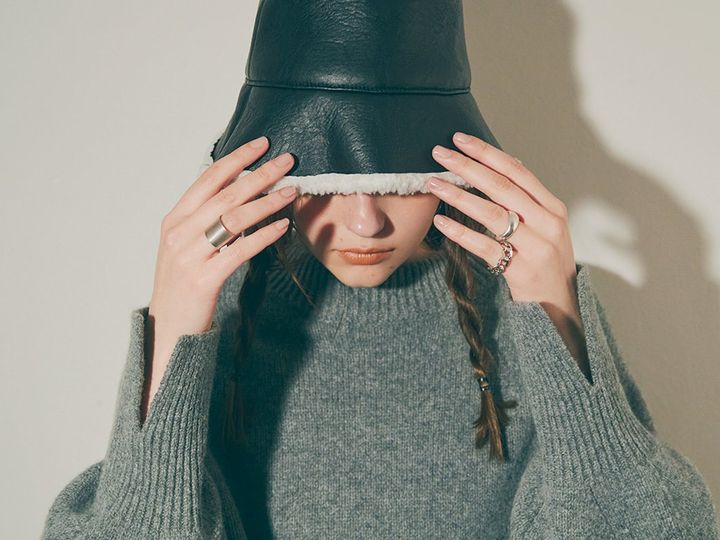 ともすると、重く、こってりして見えがちなレザーハットには、無機質なシルバーリングをかけ算。ひんやりとした色と質感が、レザーのぬくもりを裏切り、適度な緊張をもたらしてくれる。