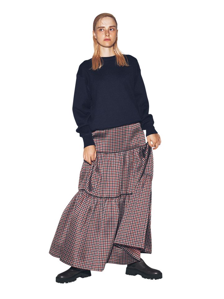 普通のトップスでもさまになる、ダイナミックなゆれ感のティアードスカート。色の中でも引き締め力の高い赤と黒を細かく散りばめることで、派手さなくシルエットの甘さをそぎ、なつかしく大人っぽい絶妙なさじ加減に。模様自体にキレのある、ほっこりしにくい千鳥格子柄も使いやすいポイント。