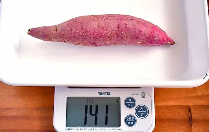 電子レンジ加熱を行うにあたり、生のサツマイモは1本141gのものを使いました。