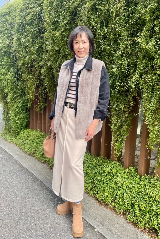 デニムが好きですが、分厚いコートにはまだ早い時季なので、ファーのジレをレイヤードして季節感を出してみました。ボトムスは丈感を重視してスタイルアップできるものをセレクトしています。タイトなスカートですが歩きやすい素材で見た目より楽チンです」