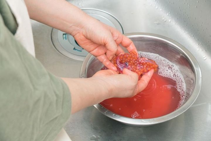 生すじこをいくらにするには、ぬるま湯でほぐしながら皮や血合いを取り除き、それぞれの家庭の味付けで醤油漬けにしていきます。