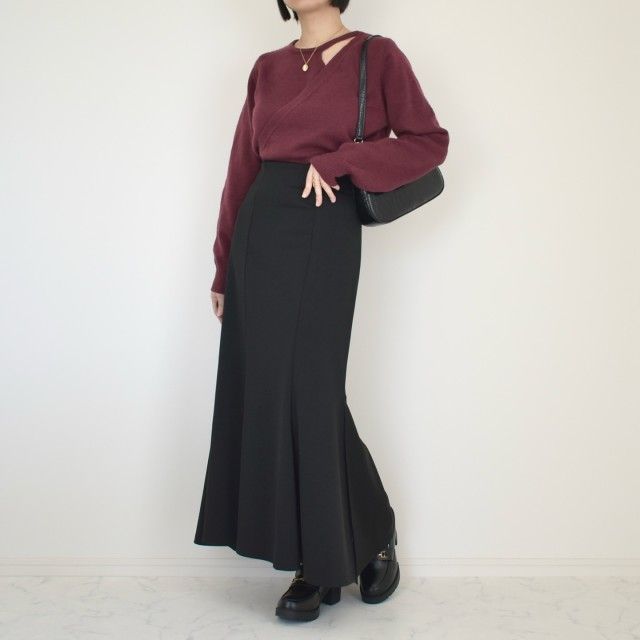 鮮やかなレッドがちょっと派手に感じたら、少し落ち着いたボルドーを使ってみるのも◎。シックな色合いですが、赤味を感じるカラーリングがクリスマスの気分を盛り上げてくれますよ。レディなスカートと厚底ブーツを組み合わせれば、大人カジュアルな仕上がりに。