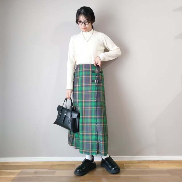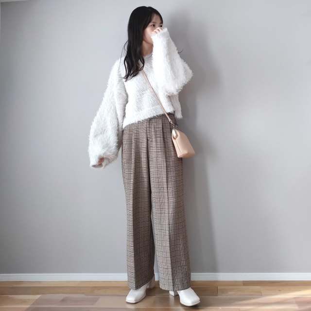 こちらは、グリーンのボトムスをホワイトニットでクリーンにまとめたコーデ。チェック柄も相まって、冬の季節感たっぷりなおしゃれスタイルに仕上がっています。柄モノを取り入れることで、冬の重めアウターを羽織ってもスタイリングに奥行きが生まれるというメリットもアリ。