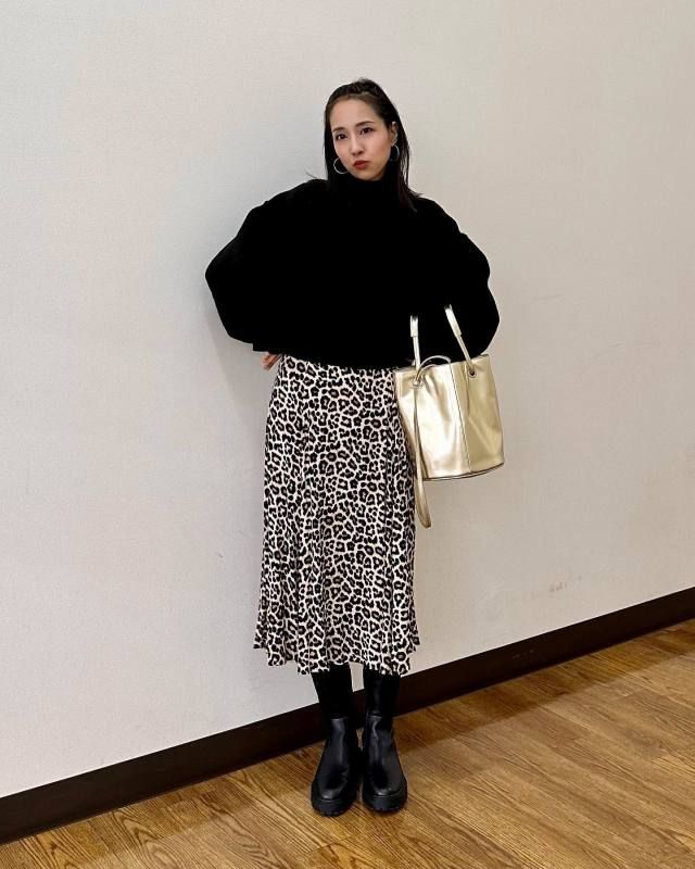 こちらはモノトーンコーデにゴールドのバッグを添えたスタイル。他アイテムの色味を抑えることで、ゴールドの輝きを生かしつつ着こなしやすいコーデバランスが実現します。
