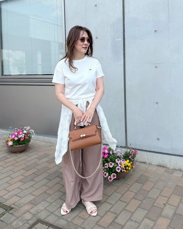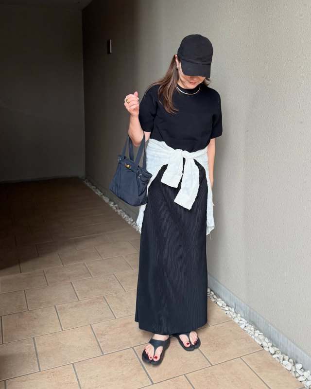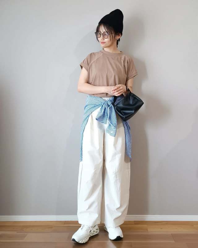 トップスと同じ色のシャツを腰巻きすると、シャツの存在感が控えめになります。腰巻き初心者さんでも挑戦しやすいコーデバランスですよ。