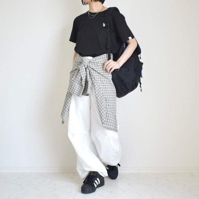 まずご紹介するのは、すっきりトップスのシンプルスタイルにチェックシャツを腰巻きしたコーデ。ベーシックなお洋服の時は、柄シャツを使ってアクセントをつけるのがおすすめです。