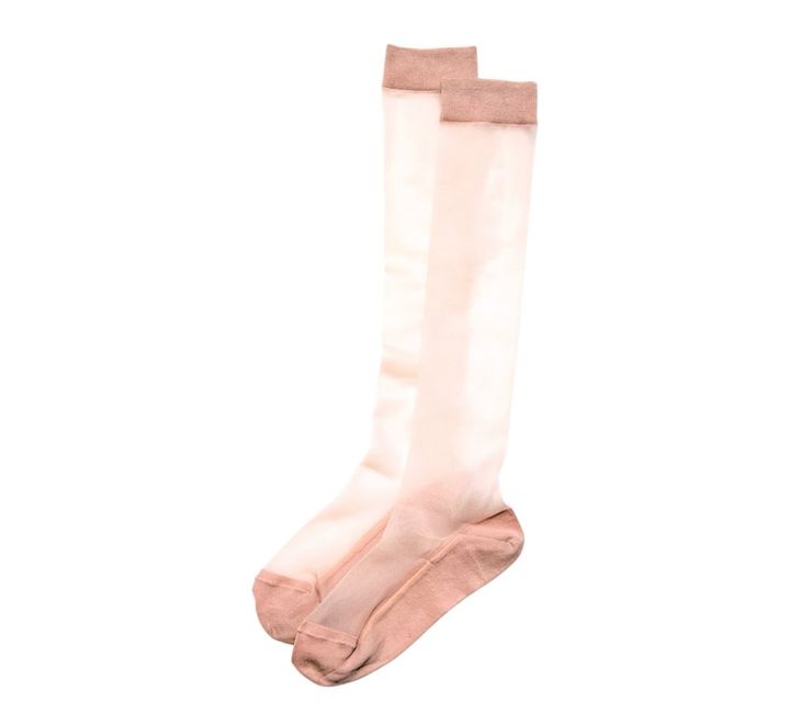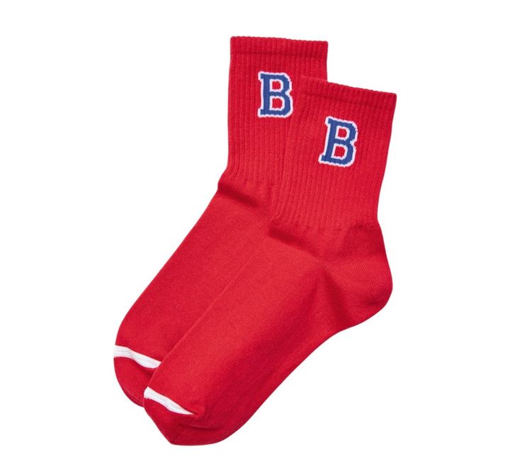 【上から】赤×青のポップな配色にロゴ入りで鮮度抜群! ソックス¥990、ミニスカートに合わせてはきたいシアー素材。ソックス¥1,210、ガーリー度爆上がりのリボン付き♡ ミュールサンダルに合わせて、とことん乙女な着こなしを。ソックス¥1,540/以上すべて靴下屋(タビオ)