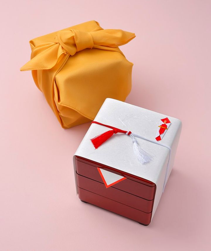 熨斗を掛けたお重を風呂敷で包んだ状態でお届け。家族での集まりや新年のご挨拶品、贈答品としてもぴったりです。風呂敷は「黄色」と「紅白千鳥」の2種類から選べて、全国配送も対応可。