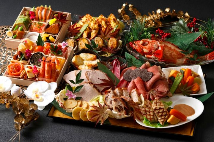 あわせて楽しみたいのが、世界三大珍味と称されるキャビア・フォアグラ・トリュフを贅沢にとり入れたラグジュアリーな四段重。鮑やフカヒレ、松茸や金目鯛など高級食材をふんだんに盛り込み、伝統的な和のおせちに洋のモダンなエッセンスを重ねた、新年の食卓をスタイリッシュに演出するおせちです。