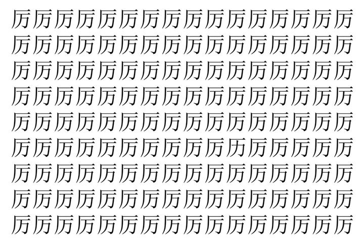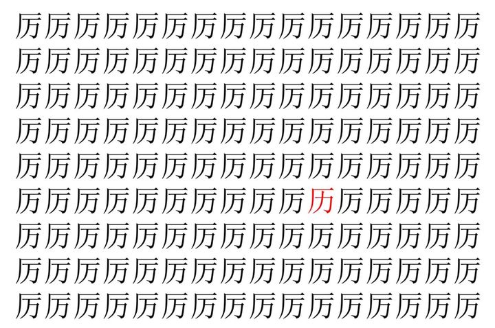 画像の中には、「厉」という漢字が縦に9行、横に16個並んでいます。 全部で144個となりますが・・・、そのうち1つは「異なる漢字」となってますよ!!