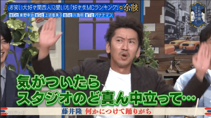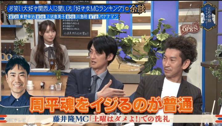 「関西人に聞いた好きなMCランキング」が発表される中、濱家から“衝撃を受けたMC”を聞かれ、「僕は藤井隆さん」と答えたのはツートライブのたかのり。「藤井さんの番組に初めて出た時、僕らが漫才を見せて。そこから座るまでに、周平をイジるのが普通じゃないですか、初対面なんで。(でも藤井さんは)ずっと僕なんですよ。僕別に普通にやってるのに、『何かあんの?』とか、『ギャグあんの?』とか、僕だけなんですよ」と述懐。