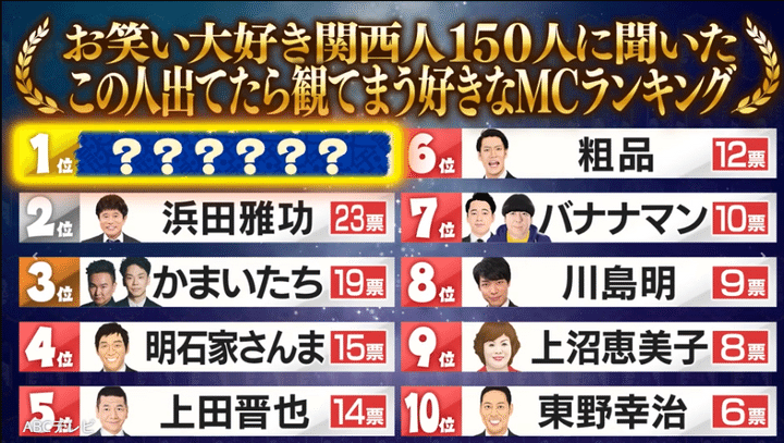 【TVer】お笑い大好き関西人150人に聞いた、この人出てたら観てまう好きなMCランキング! かまいたち、浜田雅功を抑え、1位に輝いたのは!?