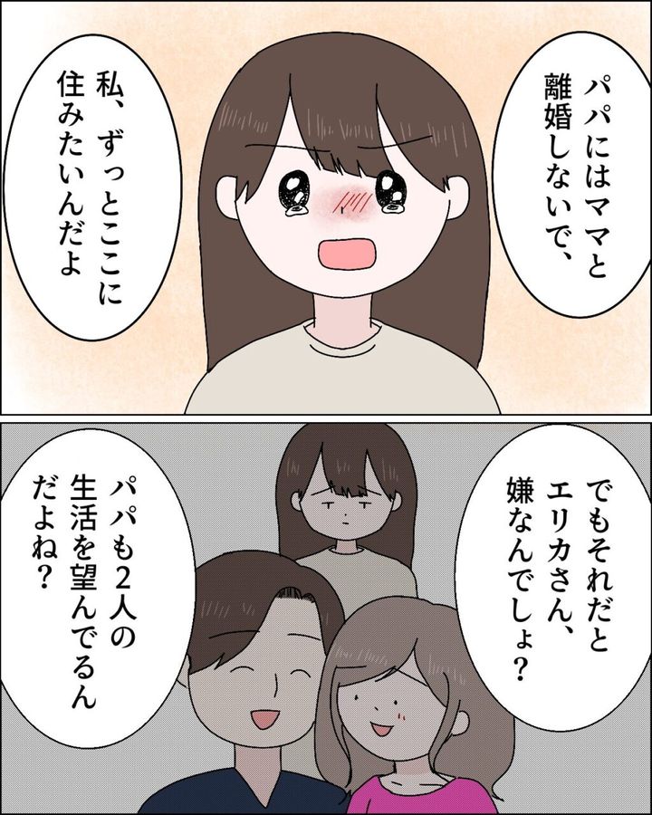 「パパにはママと離婚しないで、私ずっとここに住みたいんだよ・・・でもそれだとエリカさん、嫌なんでしょ?パパも2人の生活を望んでるんだよね?」ジュリちゃんは声を震わせ、涙目で訴えました。