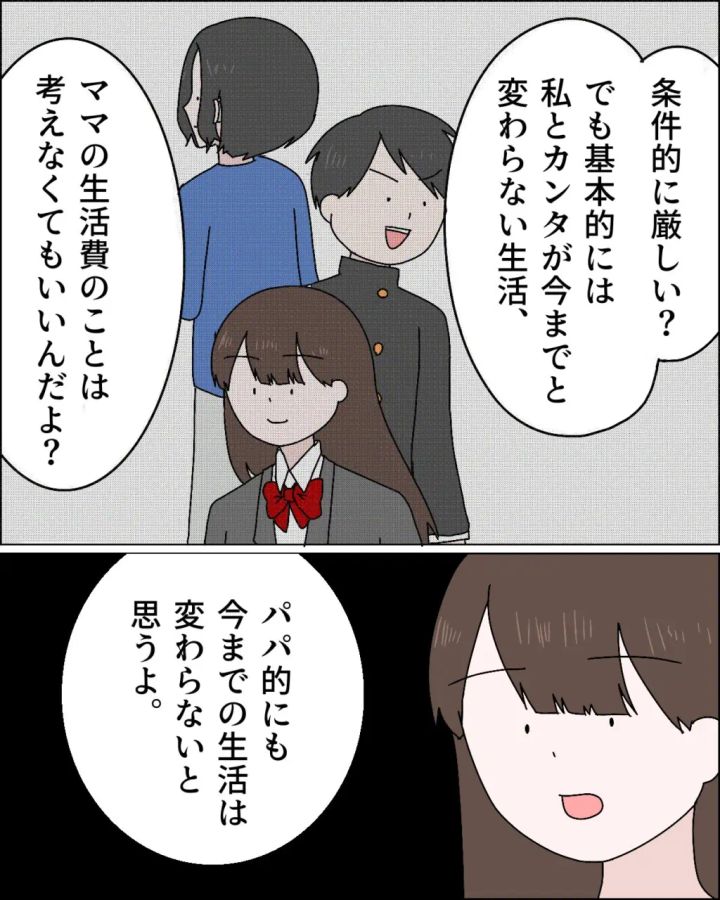 提示された金額に思わずうろたえるケイさんを前に、ジュリちゃんは落ち着いた声で言いました。「条件的に厳しい?でも基本的には私とカンタが今までと変わらない生活、ママの生活費のことは考えなくてもいいんだよ?パパ的にも今までの生活は変わらないと思う」