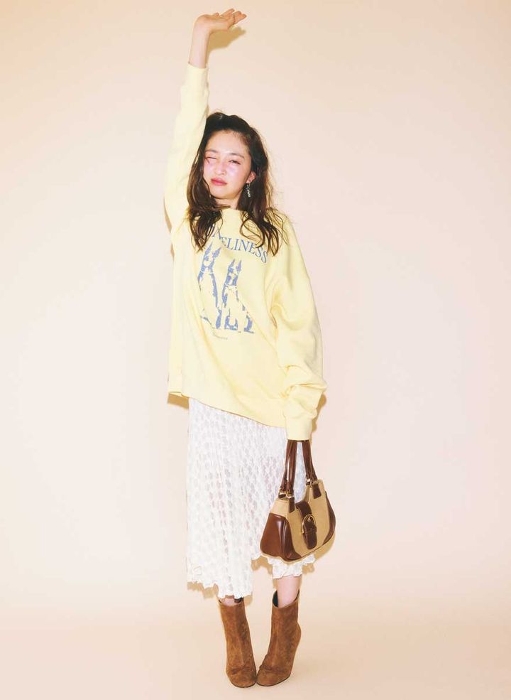 上西星来。ar11月号より イエロースウェット¥12,540/ボンロウ(ハナ コリア) レース編みスカート¥12,740/ミンジエナ(ハナ コリア) イヤリング¥2,180/ソルベ バッグ¥8,470/マウジー(バロックジャパンリミテッド) ブーツ¥19,900/チャールズ&キース スカートの中にはいたペチコート/スタイリスト私物