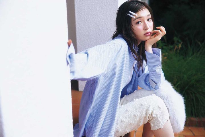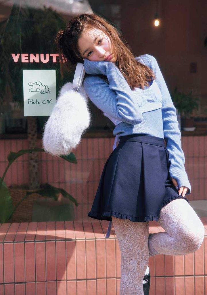上西星来。ar11月号より 水色ボディスーツ¥19,580/ロザリームーン(ロザリー) シャツ&ビスチェセット¥24,200/ファーファー ネイビーミニスカート¥14,520/マーガリンフィンガーズ(ハナ コリア) ファーバッグ¥19,800/シャポードオー(シャポードオー 東急プラザ銀座店) タイツ¥1,650、ソックス¥1,430/靴下屋(タビオ) シューズ¥17,600/ダイアナ(ダイアナ 銀座本店)