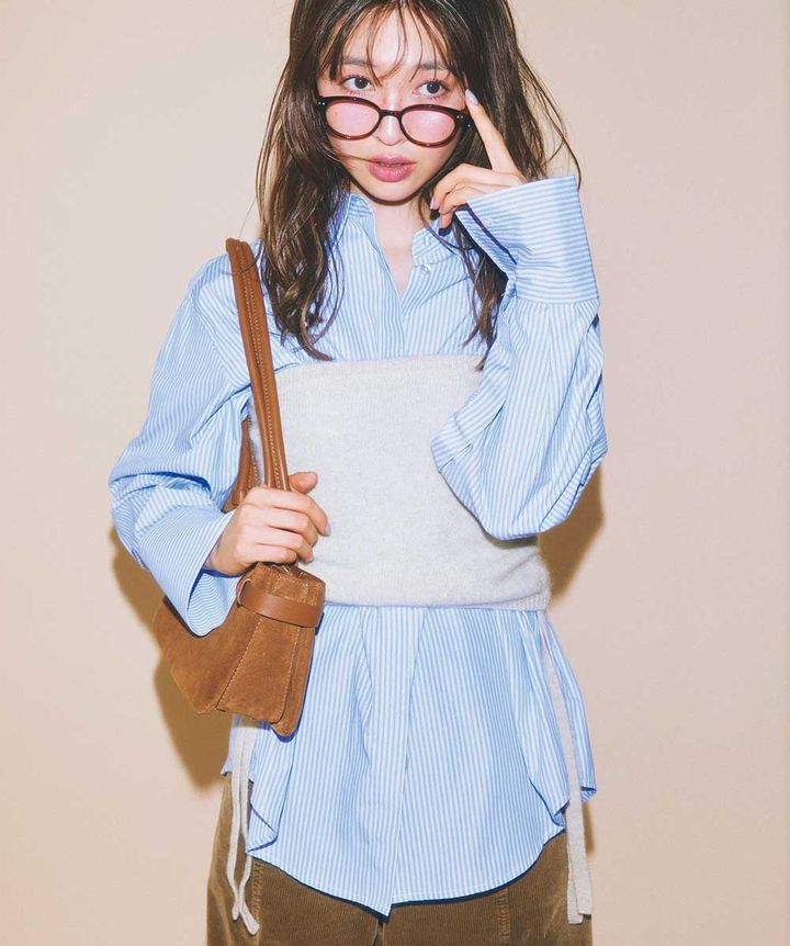 上西星来。ar11月号より アンゴラツインニット¥41,800 /ロザリームーン(ロザリー) シャツ&ビスチェセット¥24,200/ファーファー コーデュロイパンツ¥44,000/バウム・ウンド・ヘ ルガーテン(エスアンドティ) メガネ¥880/パリスキッズ原宿店 バッグ¥29,900/チャールズ&キース