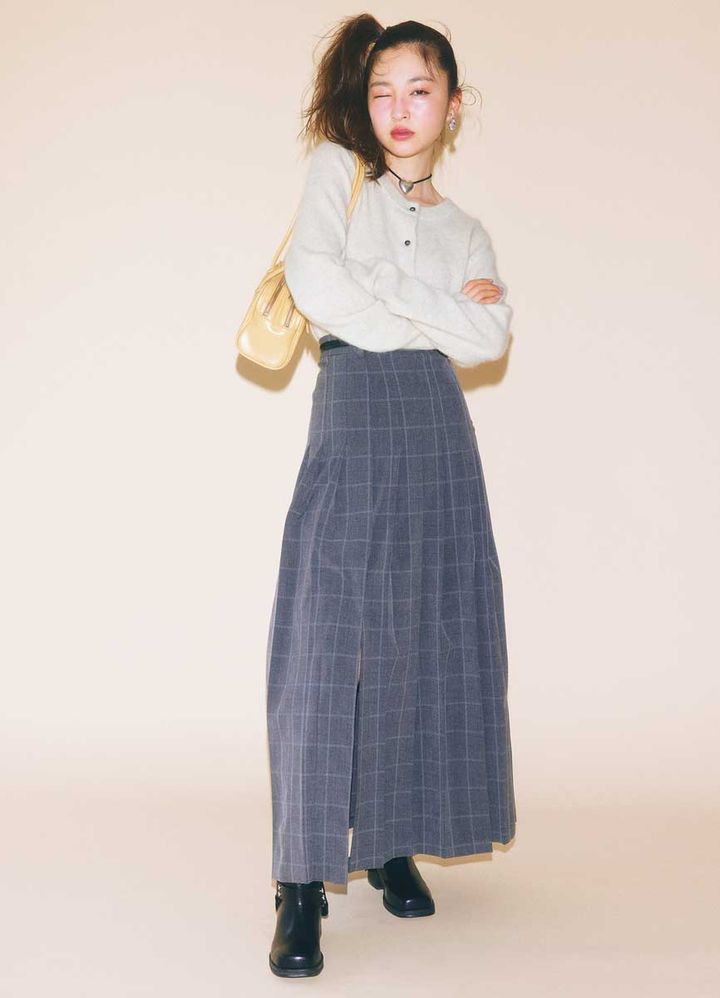 上西星来。ar11月号より アンゴラツインニット¥41,800 /ロザリームーン(ロザリー) チェック プリーツスカート¥27,500/ ロザリームーン(ロザリー) ロングブーツ¥29,700/ アスラ(ハナ コリア) イヤリング¥2,200 /ユー チョーカー¥16,940/トゥワクリム(ハチマルゴショールーム) バッグ¥21,560/クリスティーンプロジェクト(ハナ コリア)