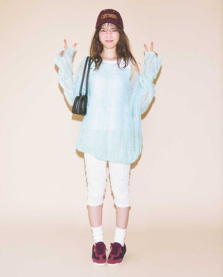 上西星来。ar11月号より ミントゆるニット¥20,540/ミンジエナ(ハナ コリア) レイヤード タンクトップ¥7,700/レイ ビームス(レイ ビームス 新宿) クリーム バイカーパンツ ¥14,300/ハニー ミー ハニー キャップ¥4,620/コンバース(クリハラ コーポレーション カスタマーセンター) バッグ¥13,900/チャール ズ&キース ソックス¥1,210/靴下屋(タビオ) スニーカー¥14,300/ プーマ(プーマ お客様サービス)