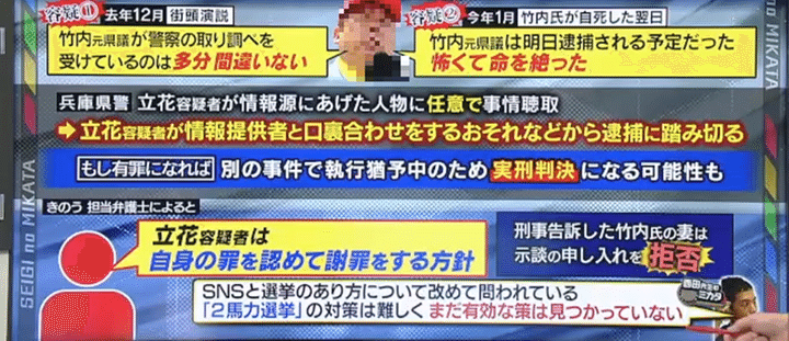 竹内氏が辞職した後も立花容疑者は、「竹内元県議が警察の取り調べを受けているのは多分間違いない」と街頭演説で発言。竹内氏が自死した翌日には、「竹内元県議は明日逮捕される予定だった。怖くて命を絶った」とコメントし、これら発言から立花容疑者は逮捕された。死者に対する名誉毀損容疑での立件は異例だが、もし有罪になれば、立花容疑者は別の事件で執行猶予中のため、実刑判決になる可能性がある。